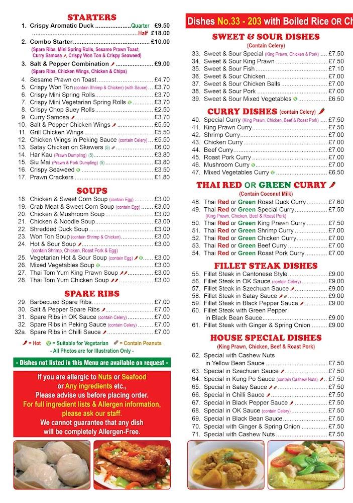 Lee's Garden boasts an extensive menu that caters to varied tastes. Starters include crispy aromatic duck and a range of salt and pepper dishes that really pack a punch. The soup section offers comforting options like chicken & sweet corn soup and crab meat & sweet corn soup—a perfect way to warm up on cooler days. A delightful selection of curries and sweet & sour dishes invites exploration, whether it's the king prawn curry or the sweet & sour special. Their range of chicken, beef, and seafood dishes is expansive, ensuring there's something for everyone. Noteworthy mentions include the grilled chicken wings, house special dishes cooked in black pepper or ok sauce, and an impressive selection of fried rice. Don't forget to try the special lunch options that provide a fantastic value for money.